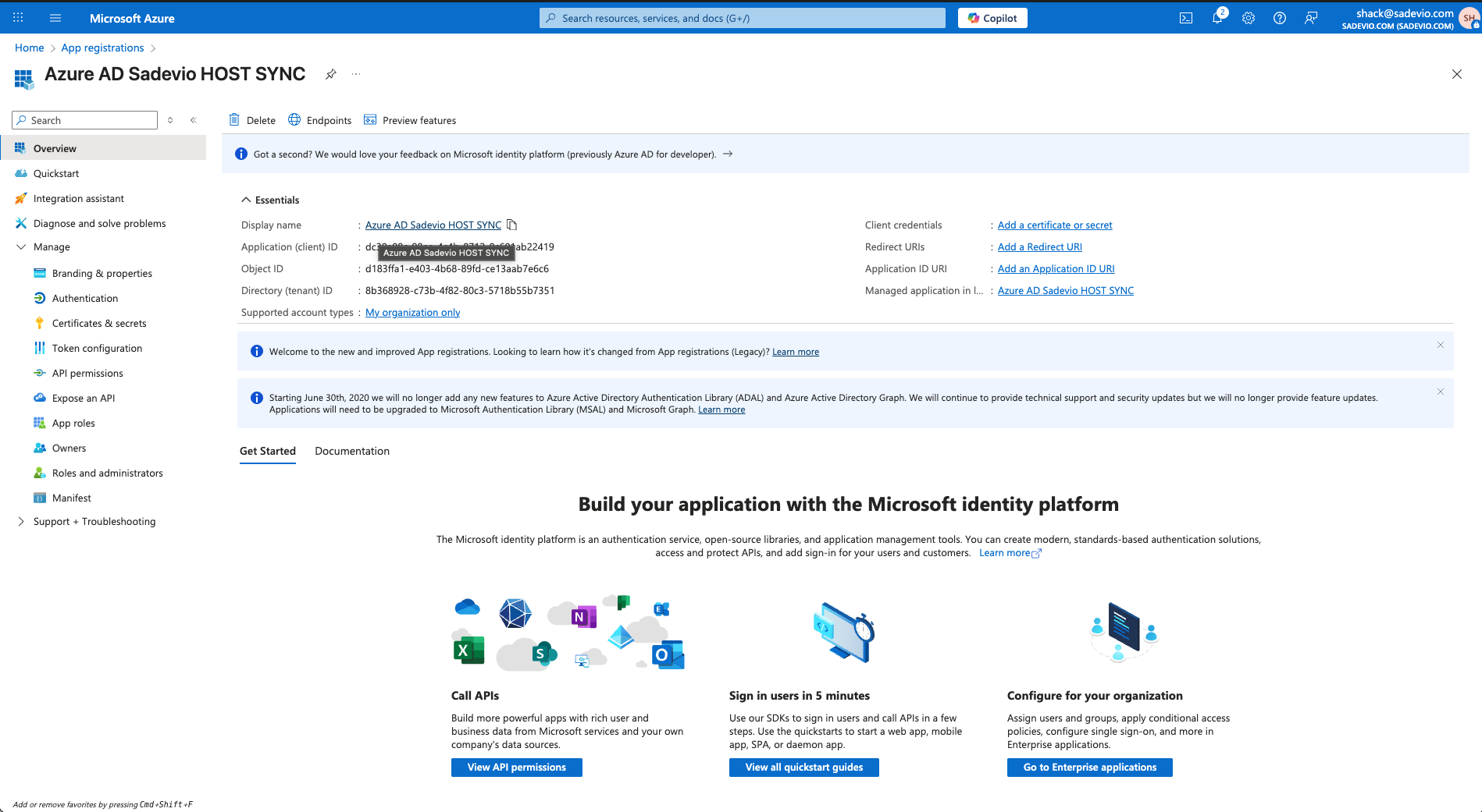 - In the new app, go to "Manage" -> "API permissions"